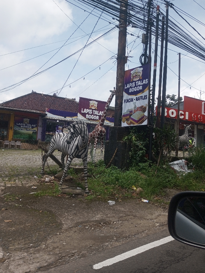 The image captures a roadside commercial area. Contrary to the provided location of Chori, Nigeria, visual evidence from prominent banners displaying "Lapis Talas Bogor" and "Puncak - Raffles" strongly indicates a location in Indonesia, specifically near Bogor and Puncak. The scene is viewed from a low angle, with a black car side mirror visible in the lower right foreground. The immediate foreground features an asphalt road with a white solid line, transitioning to an unpaved, uneven dirt verge with sparse green grass and scattered litter, including a coconut husk. Mid-ground elements include two prominent animal statues: a life-sized, black-and-white striped zebra in a walking pose on the left, and a taller, brown-and-tan spotted giraffe behind a utility pole. The central utility pole is thick, wooden, and heavily laden with numerous black electrical and communication wires that crisscross against a light blue, partly cloudy sky. Several vertical dark poles stand adjacent to it on the right. In the background, commercial buildings line the street. On the left, a building with a reddish-brown tiled roof and large windows features additional banners. Centrally, a building with a purple facade prominently displays multiple banners advertising "Lapis Talas Bogor" with images of layered cakes. To the far right, a red building, partially obscured, shows white lettering that appears to be "BOCI 99," with a third zebra statue partially visible in front of it. No discernible human figures are present. The environment appears to be an active, somewhat weathered commercial zone.