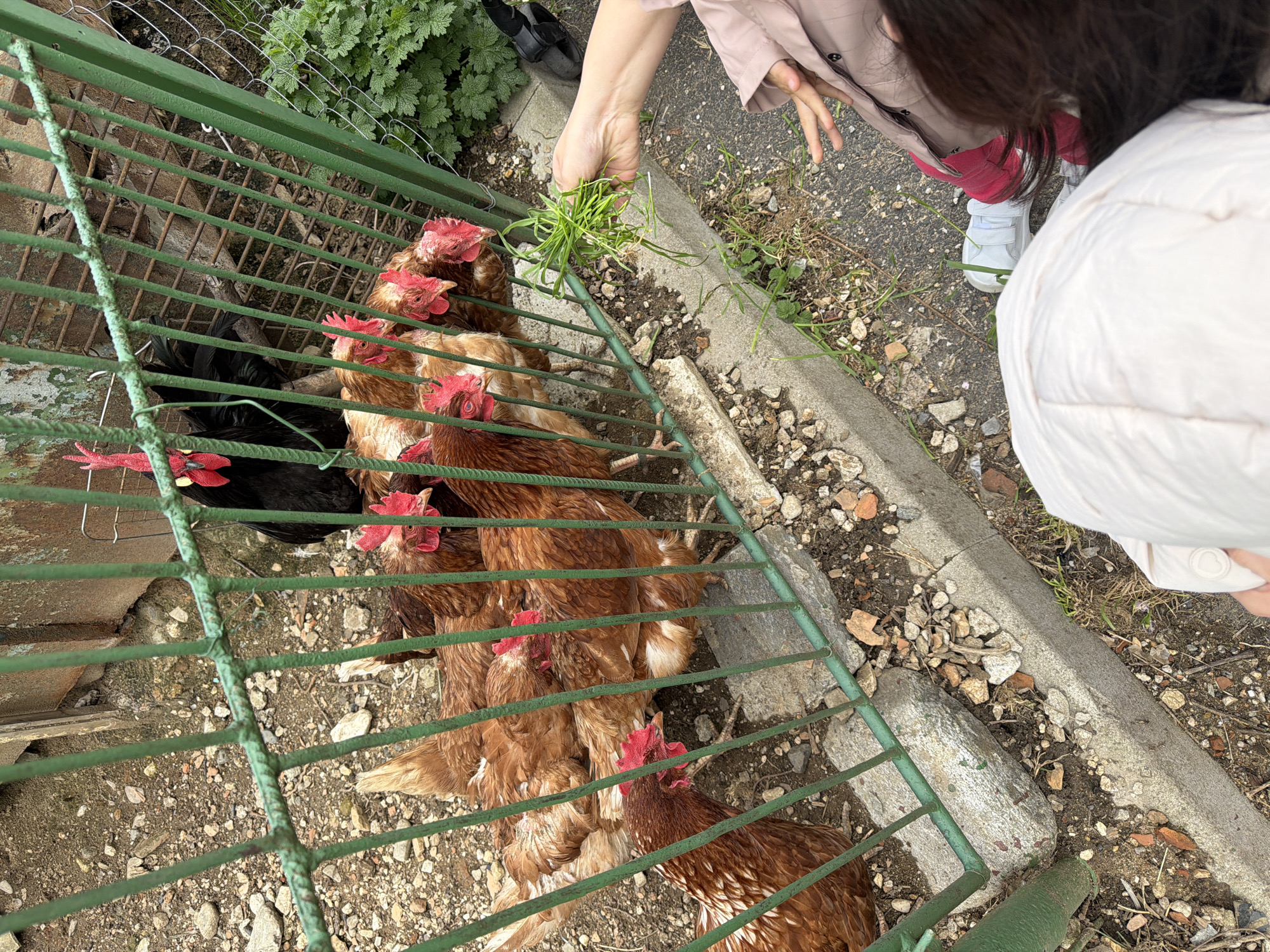 A group of brown hens are inside a green, metal fence. A hand is offering a bundle of green grass through the fence to the hens. A person with dark hair wearing a white jacket stands nearby, and another person wearing a beige jacket and red pants stands beside the fence. The ground is covered in dirt, gravel, and small rocks. The location is Zlatograd, Bulgaria.