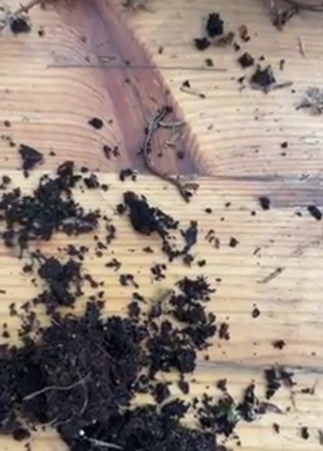 A wooden surface is shown with clumps of dirt, dry foliage, and thin twigs scattered across it