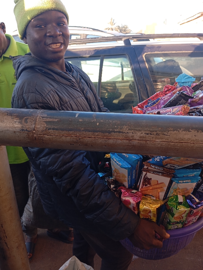 A man in a green hat and black jacket smiles while holding a purple basket brimming with assorted snacks, including "Chak-de" vanilla wafers and various chocolate bars. He stands beside a black vehicle. Another man, partially visible in a green shirt, is to the man's left. The scene appears to be outdoors.