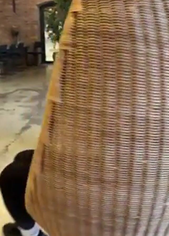 A woman enters a large, light-brown wicker egg chair. She is wearing a black shirt and black pants. She is holding a black cup in one hand and a cellphone in the other. The chair is on a light-colored rug with a pattern. In the background, there are tables and chairs, a brick wall, and plants.
