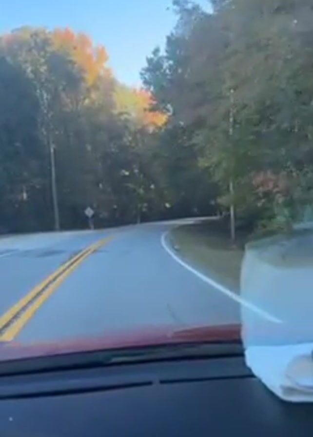 The camera is mounted inside a moving car, providing a driver's-eye view of a road winding through a wooded area