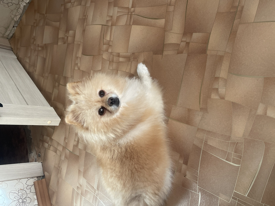 - "An indoor scene in Нижняя Уратьма, Russia, depicts a cream-colored Pomeranian-type dog lying on a light brown linoleum floor" by FM-7yvy52, licensed under CC BY 4.0