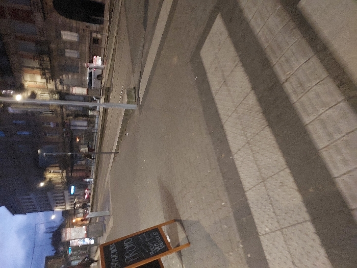 The image depicts an urban street scene in Strasbourg, France, captured during dusk or early evening hours. The specific location is a commercial street in the historic center, consistent with areas such as Rue du Vieux Marché aux Poissons. In the foreground, a light gray paved sidewalk composed of square tiles extends from the left to the bottom right of the frame. Several long, dark shadows are cast diagonally across this pavement, suggesting a light source from the left or upper left. On the immediate left, a wooden A-frame chalkboard sign stands partially visible, displaying "BOUCHERIE PROMO" in white chalk at the top, followed by "BOEUF," "VEAU," and "VOLAILLE" listed below, indicating a nearby butcher shop. Running parallel to the sidewalk in the midground are tram tracks, separated from the pedestrian area by a low, light-colored concrete barrier. A tall, slender grey utility pole, topped with an illuminated light fixture, is positioned between the sidewalk and the tram tracks. In the background, multi-story buildings with traditional European architectural styles line the street. These buildings feature numerous windows, many of which are illuminated, and some have visible balconies. On the far left, a tram stop shelter with backlit panels is partially visible. Several indistinct figures of people are present on the background sidewalks, some appearing to walk. On the right side of the street, beyond the tram tracks, a light-colored vehicle, possibly a white van or SUV, is discernible on a road. A prominent dark, rounded archway is visible within the ground floor of the building structure on the far right side of the background, suggesting a passageway or a large entrance. The overall scene is lit by artificial streetlights and building lights, giving it a muted, evening ambiance.
