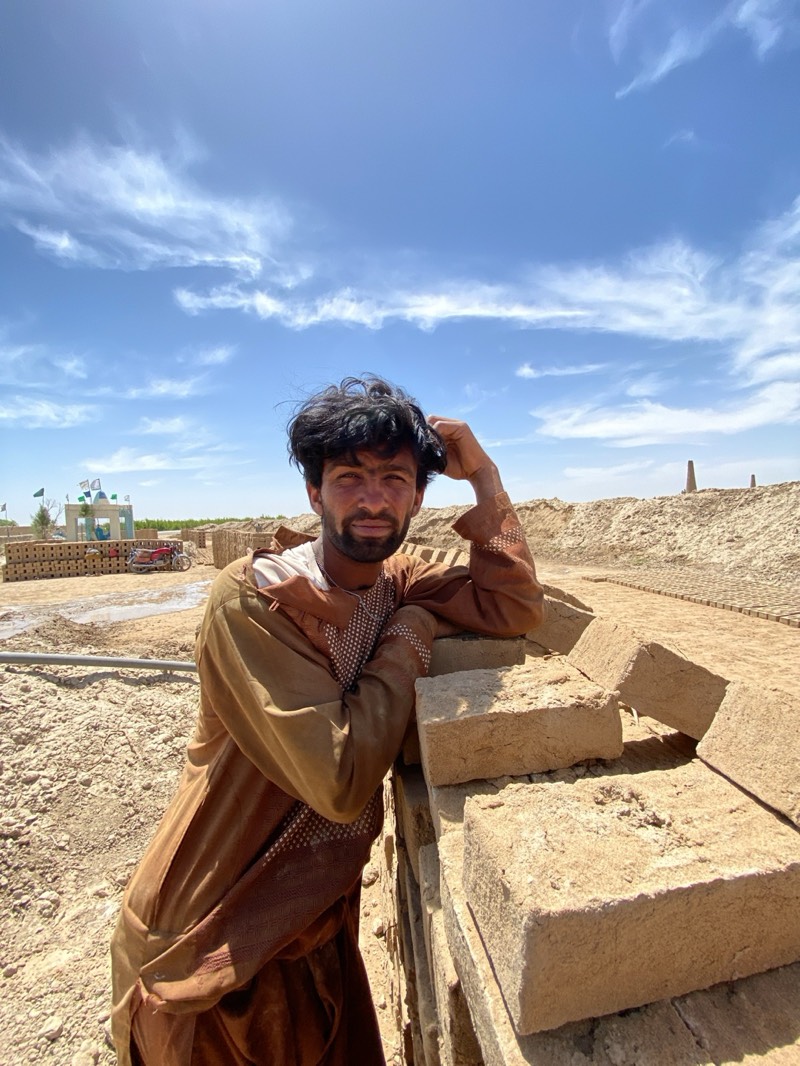 man in Deh-E Bagh, Afghanistan. He is standing outdoors in a sandy, dry area, leaning against a stack of unbaked bricks. The man is wearing a long, brown traditional robe with embroidered details along the sleeves and chest. He has dark hair and a beard and is looking directly at the camera, with his right hand resting on his head. In the background, there are stacks of bricks, a small green structure with flags, a red motorbike, and open fields. The sky is blue with scattered white clouds. The environment suggests a brick-making yard or an area where bricks are being produced.