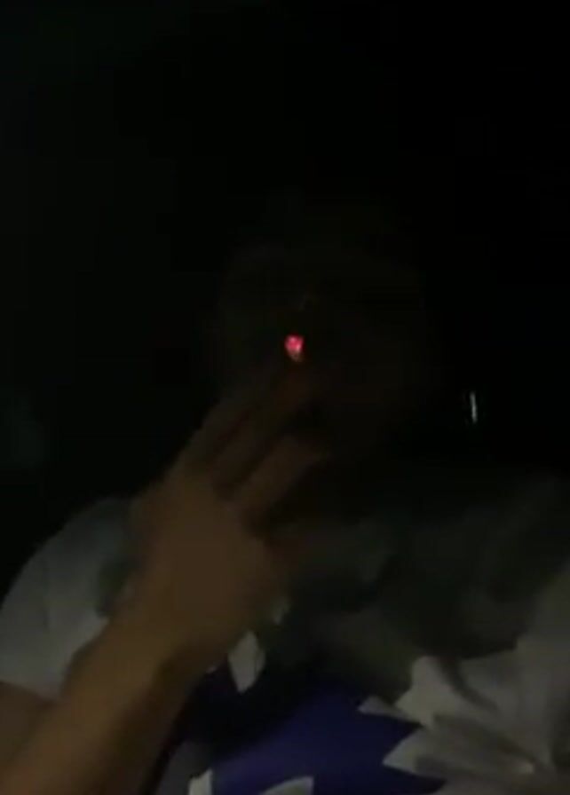 person in low light. The person appears to be male, wearing a white t-shirt with a blue design. The person is speaking. The video appears to be taken indoors or in a vehicle at night.