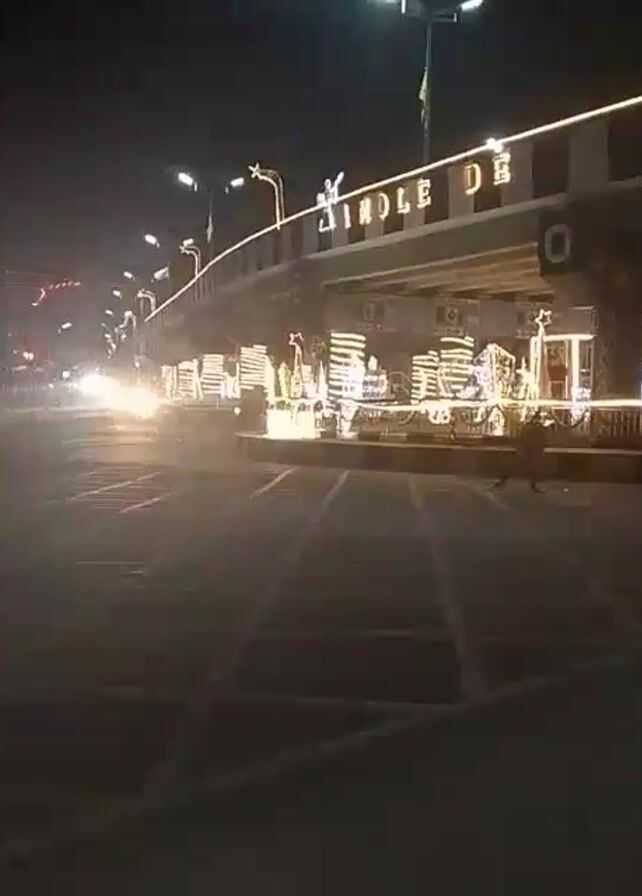 The video depicts a night-time scene at a street intersection under a bridge. The bridge has the words "NDOLE DE" written on it. The area is decorated with bright, white, festive lights. There are street lights, and the headlights of oncoming cars shine brightly. A white van is visible. The video appears to be shot from ground level.