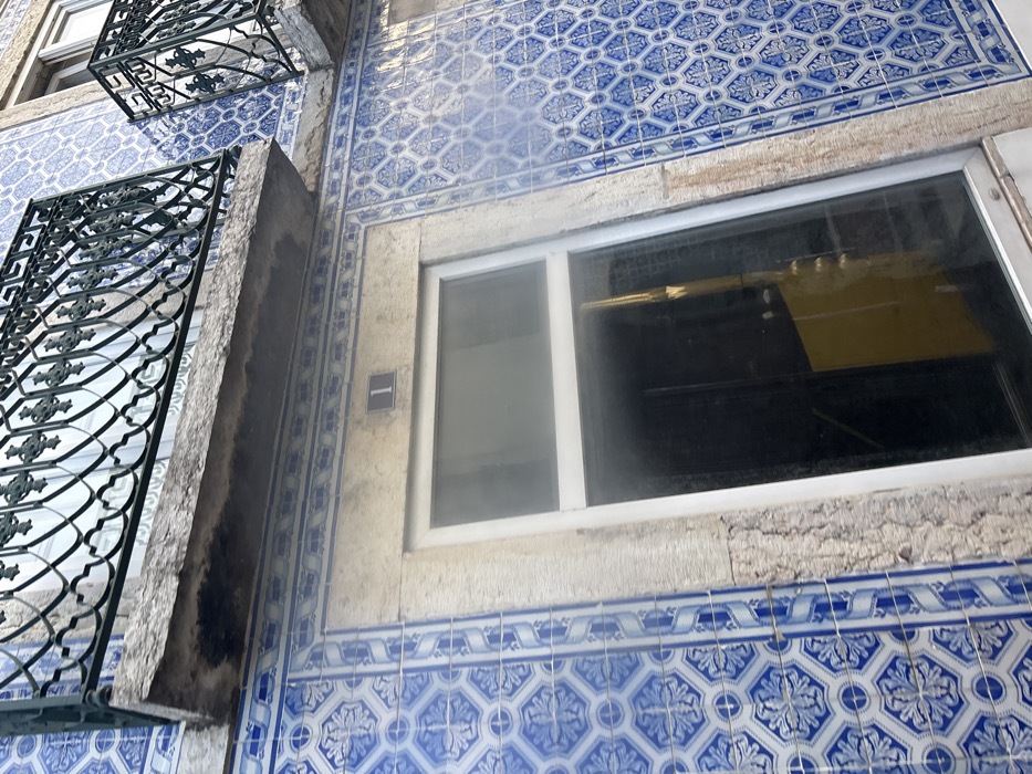 The image displays a tilted, upward-angled forensic view of a building facade located in the city of Oeiras, Portugal. The exterior is predominantly covered in traditional blue and white azulejo tiles, arranged in a repeating geometric or floral pattern. Above the mid-ground, two balconies are visible. The left balcony consists of a weathered concrete slab with a discolored underside, supporting an ornate dark green or black wrought-iron railing featuring repeating decorative motifs. A partial view of an identical second balcony is present to the right. Directly below the left balcony and centered above a ground-floor opening, the dark numeral "1" is affixed within a light gray, textured stone or concrete frame. This ground-floor opening is a large, rectangular glass window or door with a white frame. The reflective glass shows a partial, distorted interior view, dominated by a prominent bright yellow object and a dark background. No individuals, actions, or specific interactions are visible within the frame.