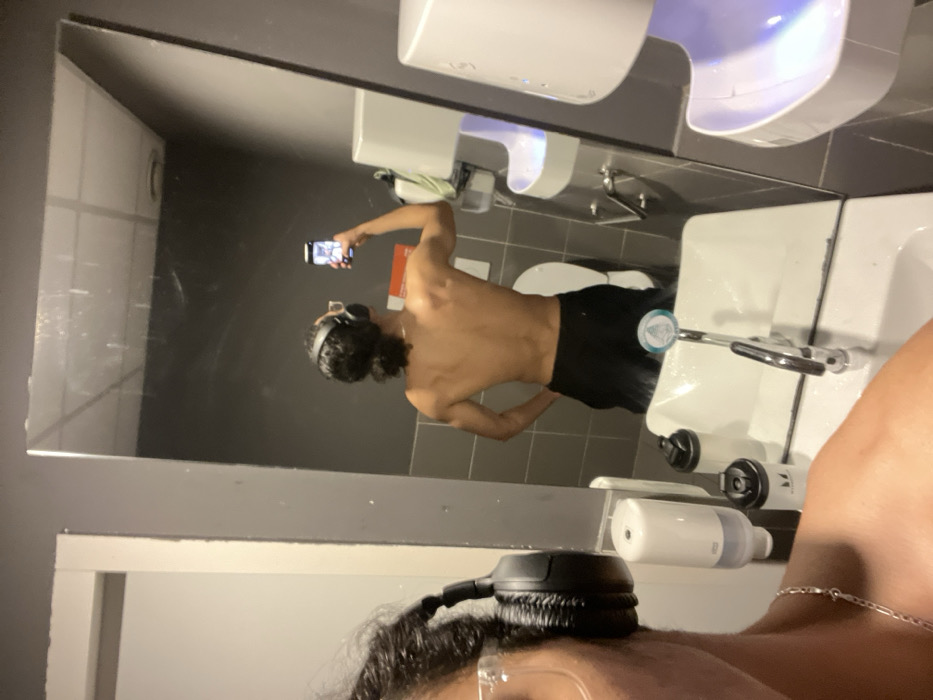The image displays a mirror selfie taken inside a modern public restroom or changing room, likely situated within a fitness facility