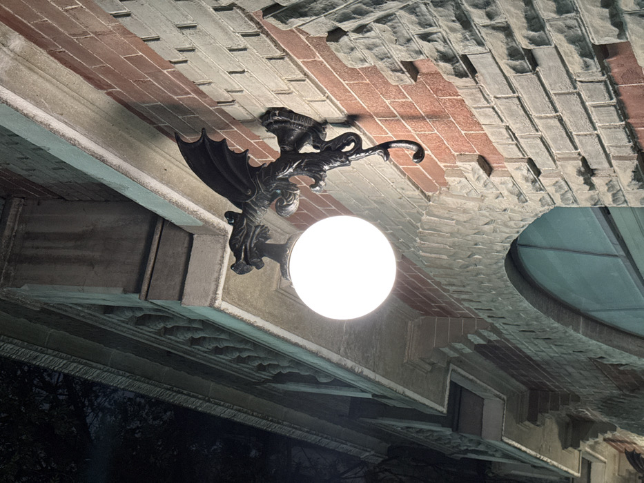 A light fixture in the shape of a dragon adorns a building's exterior. The dragon, constructed of dark metal, suspends a spherical white light. The building's architectural details include brickwork and concrete elements. The photograph is taken from a low angle, looking upward at the light fixture and the structure above it, a window can be glimpsed to the right of the frame. It is nighttime, and the background is dark.