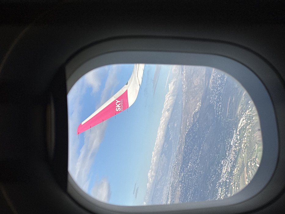 An airplane window frames a view of the Sky Express wing and the landscape below