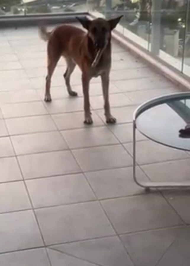 A tan dog stands on a balcony with a stick in its mouth. The dog looks around then walks towards the camera, getting close to the camera lens. The balcony is tiled and has a glass railing. In the background, there is a cityscape and the sky is orange with the setting sun. There is a round glass table on the balcony. There is a drain on the floor of the balcony.