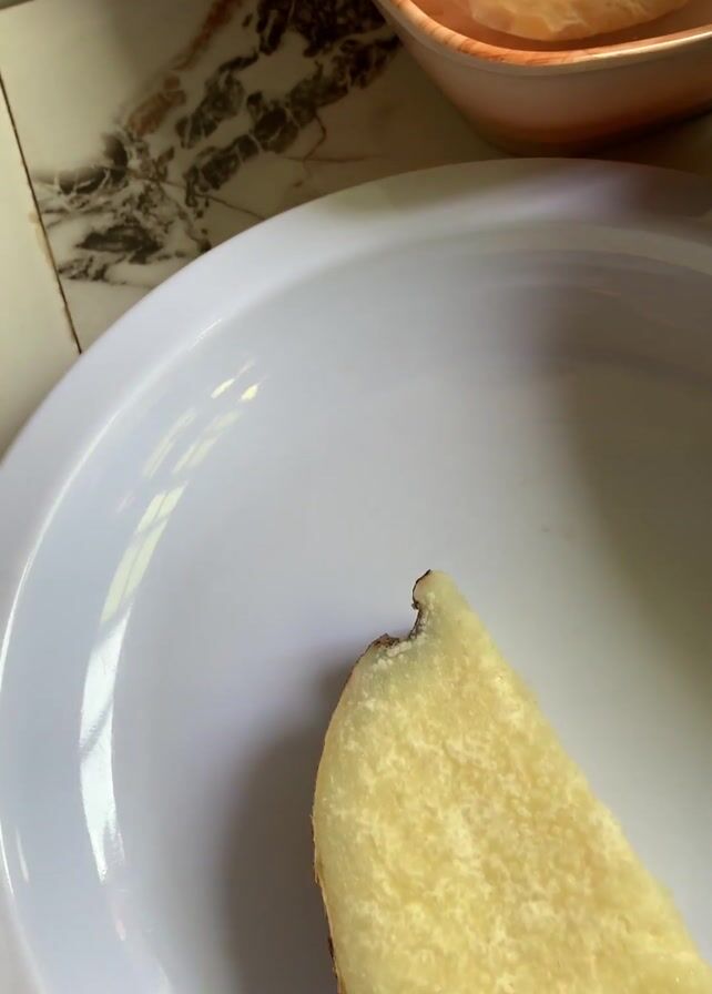 A hand places slices of yam onto a white plate. Next to the plate, there is an orange bowl with peeled pomelo fruit. The surface appears to be a kitchen countertop.