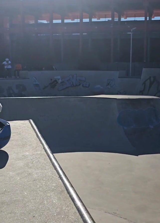 concrete skate park on a sunny day. There are four people with bikes at the back of the park near a concrete wall with graffiti. A blue helmet, a bag, and a sweatshirt are on a flat concrete ledge in the foreground. A black metal rail is in front of the ledge. In the background is a large building. The sun is very bright and creates a lot of glare in the video.