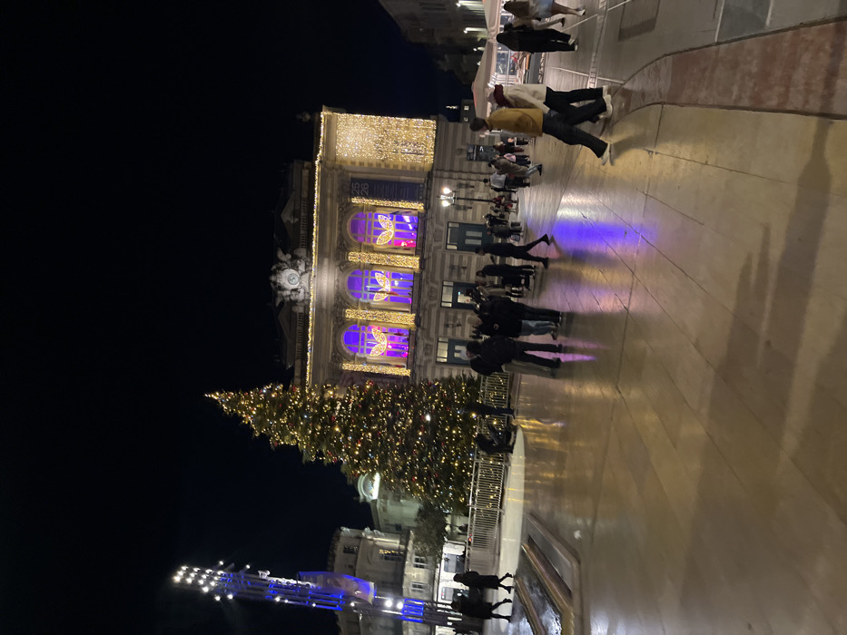 A festive night scene captures a Christmas tree adorned with lights in front of an illuminated building with arched windows. People stroll along the brightly lit pavement, their shadows stretching out. A blue-lit structure is visible in the foreground. Decorations line the building's facade, enhancing the holiday atmosphere.