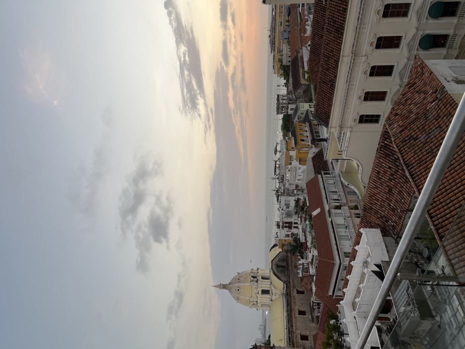 An aerial view shows a cityscape at dusk. The sky is a mix of blues and yellows, indicating sunset. Below, buildings with red-tiled roofs and white walls line the streets. A domed church stands out among the structures. The scene looks out over a body of water.