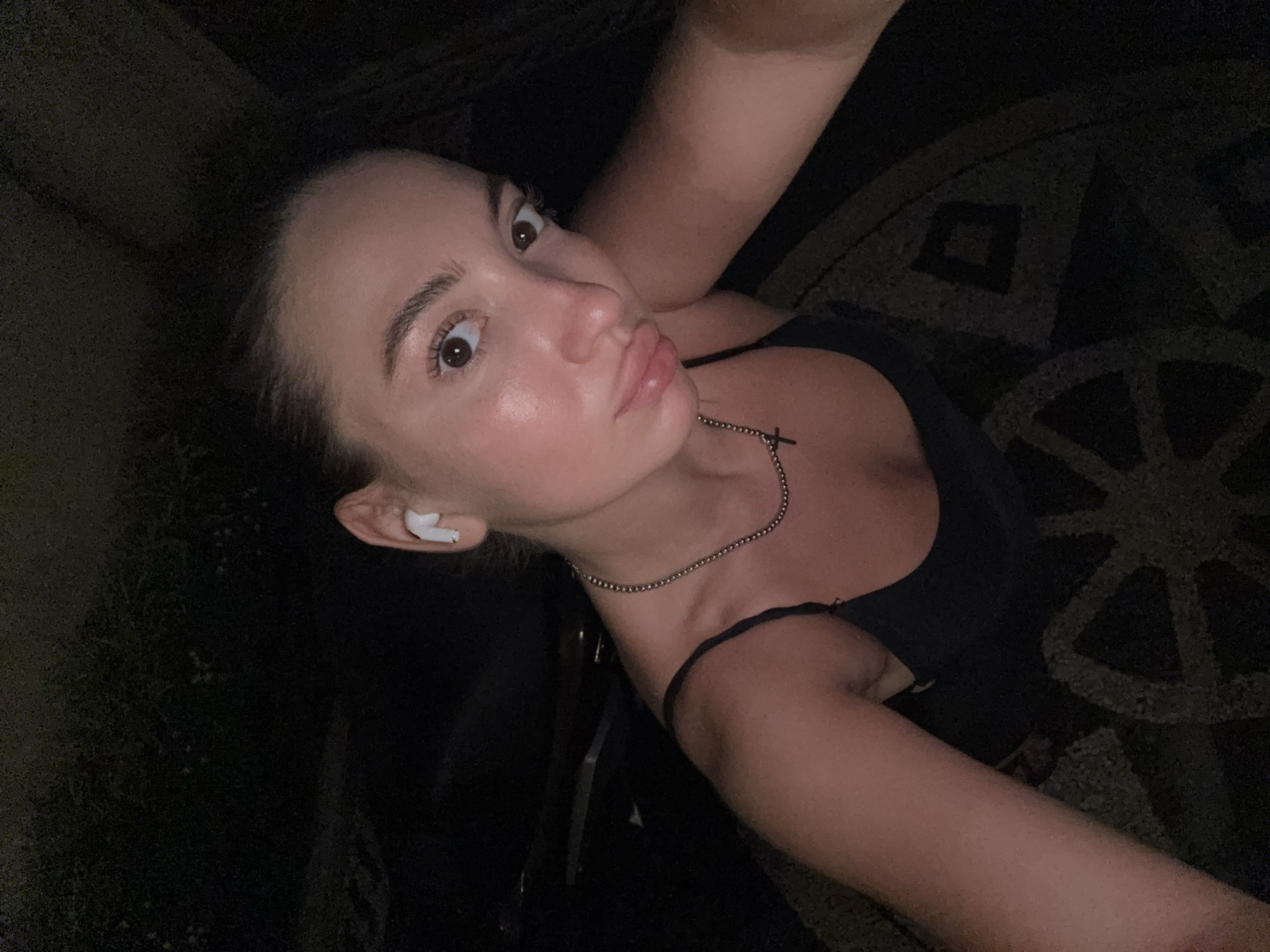 The image is a low-angle selfie of a woman with light skin, brown eyes, and her hair pulled back