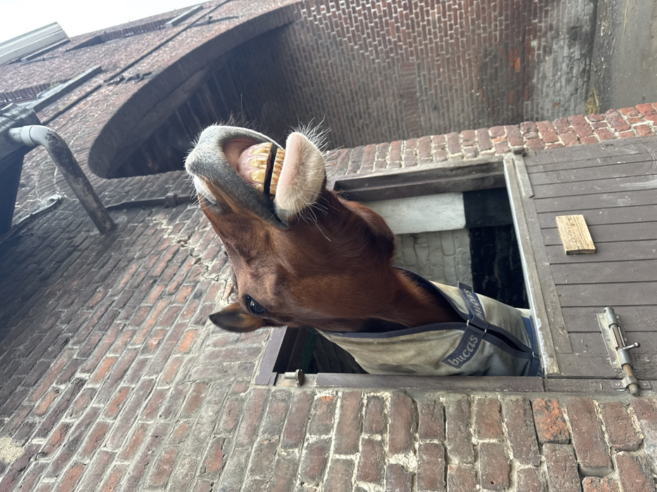 A brown horse with a grey blanket leans out of a stable window in a brick building. The horse has its mouth open, revealing its teeth and tongue. The stable door is partially open, revealing a dark interior. The building is made of red bricks, and there is an arched doorway above the stable. The sky is visible in the background. "Bucas" is written on the blanket.