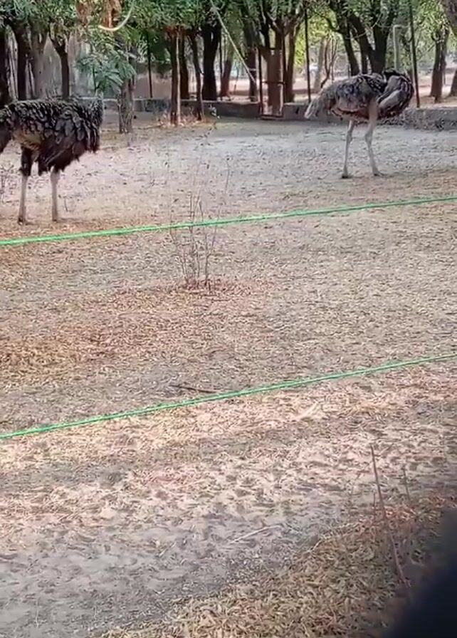 two ostriches in an enclosure. The ostriches are standing on a dirt ground covered with leaves. There are trees in the background. A green wire fence surrounds the enclosure. The video is shot from behind a fence, possibly from a visitor's perspective. The camera remains mostly still during the short clip.