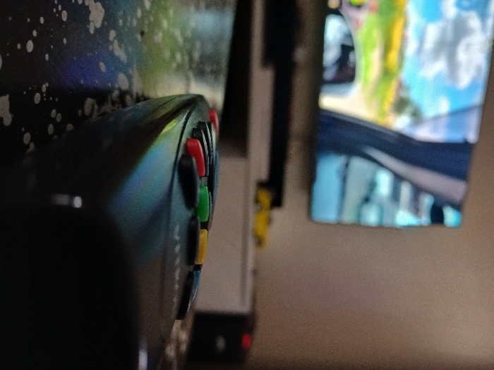 black TV remote control lying on a dark surface. The remote control is in focus, while the background is blurred. The remote control has several buttons, including four colored buttons: red, green, yellow and blue. It is in a room in Gitaru, Kenya (latitude: -1.232, longitude: 36.676). The image was taken in a room, with a television in the background. The image is captured from a low angle, with the remote control in the foreground. The image was taken indoors, with a smooth, shiny surface.