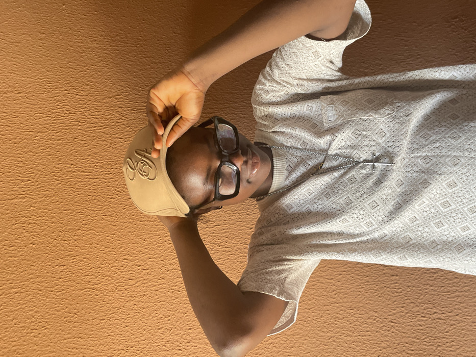 The scene is located in Ajara, Nigeria, featuring a young individual standing against a plain, textured orange-brown wall. The subject, a young person with dark skin, wears black-framed rectangular eyeglasses and a light-colored, possibly cream or off-white, short-sleeved shirt with a distinct open-weave diamond pattern. A silver-toned chain necklace with a cross pendant hangs around the neck, also featuring a small, dark bead near the collarbone. On their head, they wear a khaki or tan baseball cap with raised cursive "EA" lettering embroidered on the front. The subject's right hand is holding the brim of the cap, while the left arm is raised, with the left hand positioned near the left side of the head, indicating an adjustment or pose with the cap. The individual's gaze is directed downward and slightly to the left, exhibiting a subtle, closed-mouth smile. The environment is illuminated by direct lighting from the upper left, casting distinct shadows and highlights on the subject and the textured wall.