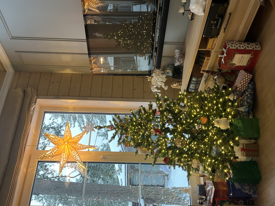 The image presents an interior scene within a residence in Finskiy Briz, Russia, decorated for Christmas