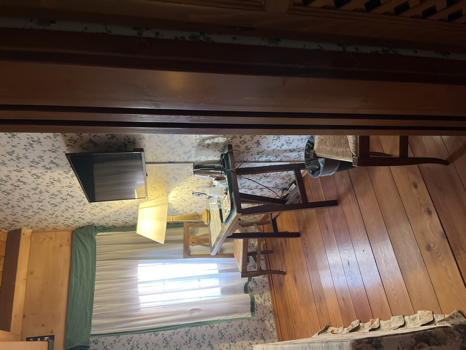 A cozy room with floral wallpaper and wood flooring