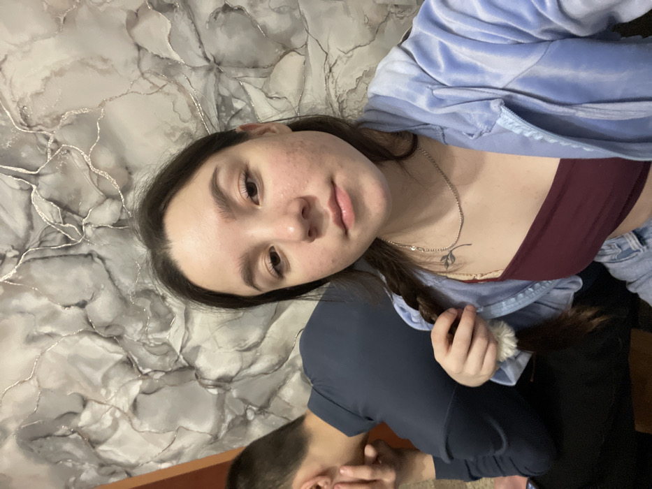 An indoor scene in Ольховка, Russia, depicts two individuals. In the foreground, a female, approximately late teens to early twenties, is positioned centrally, looking directly into the camera. She has dark hair, partially braided on her left side, secured with a white fluffy scrunchie which she holds with her left hand. She wears a light blue velvet zip-up jacket unzipped over a maroon bandeau top. A thin silver chain necklace and a small tattoo, resembling a stylized leaf or feather, are visible on her upper chest. Her complexion shows minor reddish skin discoloration on her left cheek and forehead. To her left and slightly behind her, a male figure is partially visible from the back and side, wearing a dark blue collared shirt. His right hand is raised towards his ear or jaw, obscuring part of his face. The background consists of a wall covered in a light grey and white marbled or abstract pattern with thin, wavy metallic silver lines.