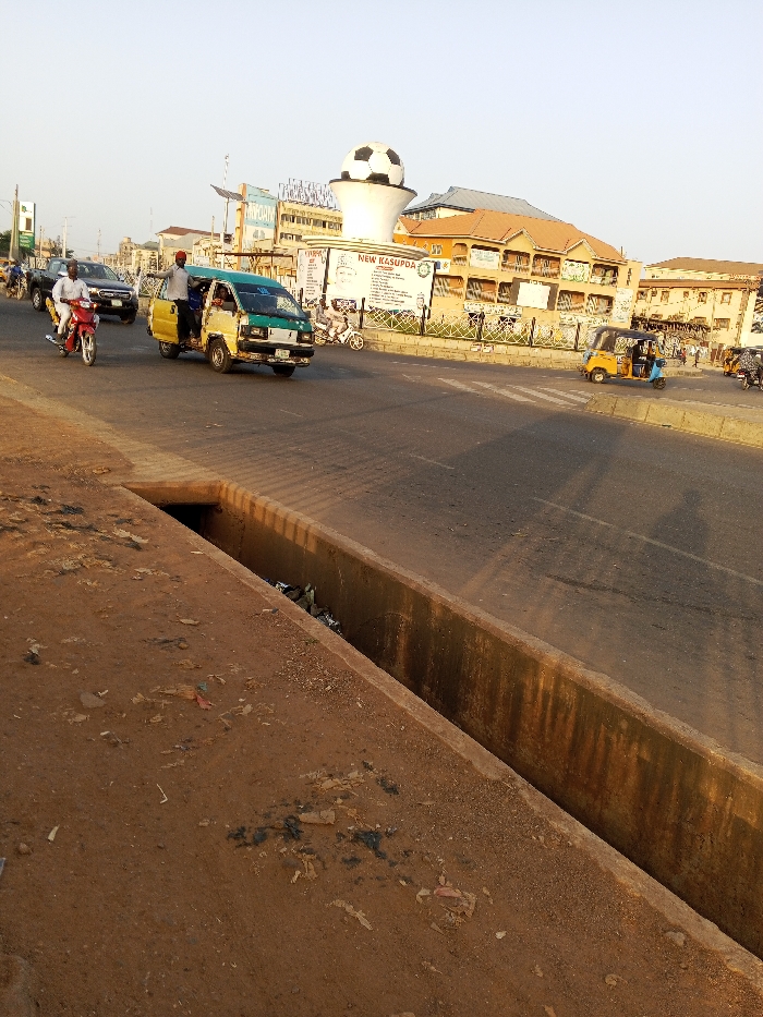This image depicts a street scene in Dadi Riba, Nigeria. In the immediate foreground, a concrete drainage channel runs diagonally from the lower left to the right, filled with refuse. The unpaved ground adjacent to the channel is reddish-brown earth mixed with scattered debris. In the midground, a paved two-lane road shows faint white markings. Vehicles are present in motion. From left to right: a man in a white tunic and cap rides a red motorcycle, positioned to the left of a dark-colored pickup truck or SUV. Next to them is a yellow and green passenger van with its side door open, carrying passengers, and driven by a man in a red cap. Further to the right, on the road, a yellow and blue motorized tricycle (keke napep) is visible. Shadows from unseen objects or individuals extend across the road from the right side. The background features a built-up area. A large monument with a white base resembling a megaphone or cup is topped by an oversized black and white football, situated on a central reservation or roundabout. Behind this monument, a green banner with white text, including "NEW KASUPDA," is affixed to a fence. Multiple buildings are visible, including a multi-story structure with a tiled roof and various windows. The sky is clear and light, indicating daytime. Additional vehicles, including other motorcycles and tricycles, are visible further down the road and in the background.