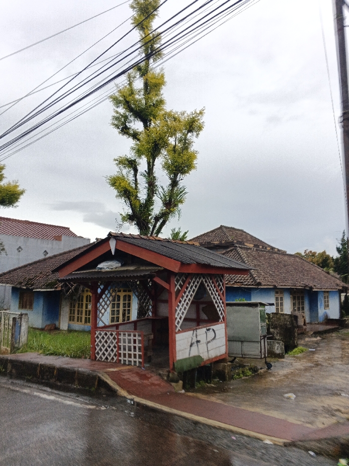 A covered bus stop with red trim sits on a wet pavement, partially obstructing a blue house with a brown tile roof. Behind the house, a tall, slender tree with yellow-green foliage reaches toward the cloudy sky. Power lines crisscross the upper left of the frame. The scene appears to be captured on a dreary, overcast day.