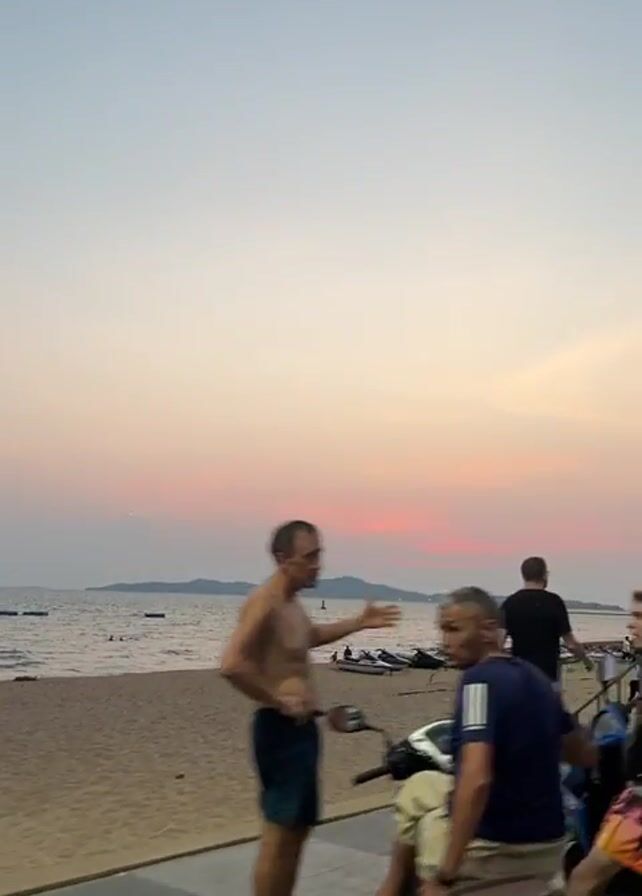 beach at sunset. Several people are on the beach, and a few are in the water. There are jet skis and a volleyball net on the sand. Two people are walking on a sidewalk next to the beach, and two people ride motorbikes. The sky is a mix of pink, orange, and blue.