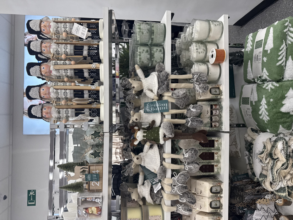 This image depicts a three-tiered retail display of Christmas-themed merchandise inside a store located in Mislata, Spain. The top shelf features five identical nutcracker figures, each approximately 30-40 cm tall, dressed in black fur-trimmed hats, white sweaters with black snowflake patterns, and black trousers, holding miniature wooden skis and poles. To their left are two small artificial evergreen trees, a flat wooden reindeer cutout, a wooden advent calendar displaying the number "24," and several green gift boxes or lanterns with star cutouts. Further left are white pillar candles and a small ceramic gnome figure. The middle shelf showcases a line of nine plush reindeer figures with long, dangling legs, each wearing knitted sweaters (mostly white and grey, with one central figure in green) and fluffy grey boots. Price tags are affixed to some of these figures. Below the reindeer are several small, house-shaped cardboard boxes and a few display sets containing four miniature jars. To the right, numerous glass jar candles are stacked, with the upper tier containing green candles and the lower tier holding white/cream-colored candles, some retaining their plastic packaging. A single orange spool of ribbon rests among these candles. The bottom shelf displays multiple folded green and white blankets or throws adorned with a repeating white Christmas tree pattern. To the left, other folded textiles with varied patterns and textures, along with small wooden Christmas tree decorations, are visible. The store environment includes white metal and particle board shelving units. Overhead, a security camera and a green emergency exit sign are visible. A large, blurred screen or poster showing a human figure is in the upper background, with reflections of store fixtures below it. The floor visible on the right is dark grey or black. No individuals are present in the scene, and no actions or interactions are depicted.