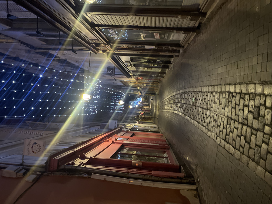 A narrow cobblestone street is illuminated by overhead lights. Storefronts line the left side, with awnings and window displays visible. String lights stretch across the street. The right side of the street is primarily cobblestone. The scene evokes a sense of old-world charm and nighttime ambiance.