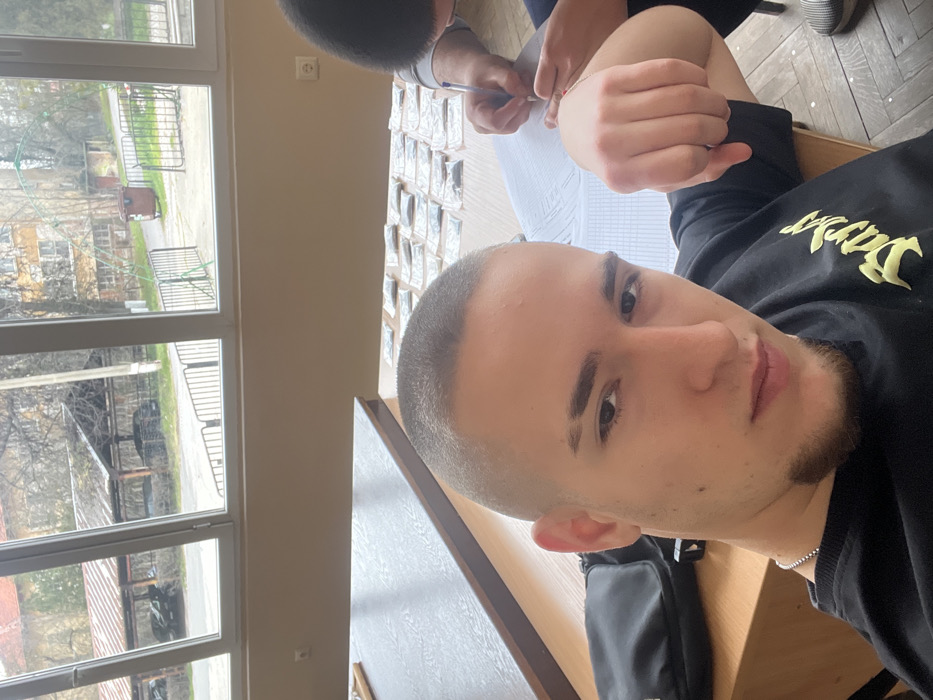 The image depicts an indoor scene in what is described as the city of Yambol, Bulgaria, viewed from a slightly elevated perspective. In the foreground, a young male with a shaved head and a short chin goatee is centered, looking directly into the camera, likely taking a selfie. He wears a dark, short-sleeved shirt with light-colored stylized text, a silver chain necklace, and a red string bracelet on his left wrist. He is seated at a light-brown wooden table, with a black bag positioned to his left on the table surface. To the right of the primary subject, another individual is partially visible from the shoulders up, wearing a light-colored long-sleeved garment. This person's hands are engaged in writing on a white document with a blue pen. The table surface in front of this individual is covered with an organized display of approximately 30-40 small, transparent plastic bags, each containing discernible plant material, arranged in multiple rows. The indoor environment features a light-colored wall with a visible white electrical outlet and a wooden parquet floor. A large, multi-pane window spans the upper background, offering a view of an outdoor urban setting. The outdoor scene, viewed through the window, shows an area under what appears to be an overcast sky, with bare trees indicating a cooler season. Visible elements include a covered parking structure with a corrugated roof housing dark vehicles, a green metal fence or barrier, a dark brown waste bin, and portions of various buildings, one with a reddish-brown tiled roof. A paved surface is also present.