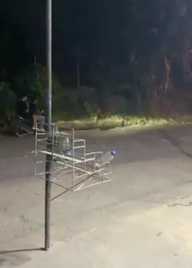 The scene is at night with artificial lighting, featuring a metallic shelf structure attached to a pole on the left side of the frame. Two plastic water bottles are placed on the shelves of the structure. The ground is paved and appears slightly damp. In the background, foliage is visible, suggesting a natural or overgrown area. A scooter carrying two people passes by from left to right. The scooter has a headlight and illuminated signals. Another scooter carrying one person can be seen further in the background.