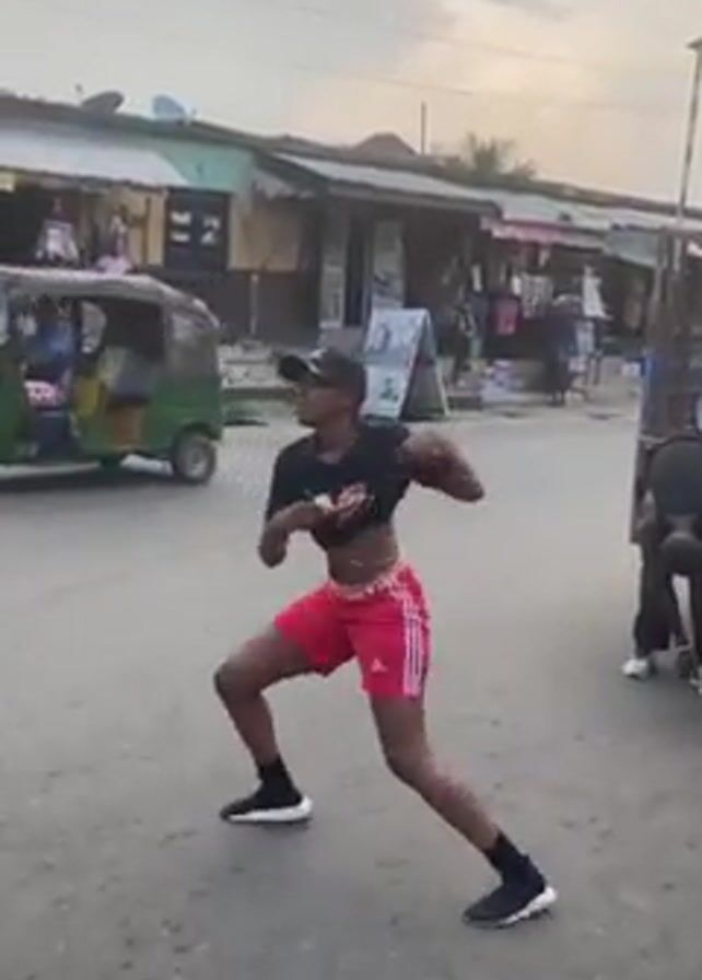 young person dancing in the street, in front of a small group of people standing next to a pickup truck