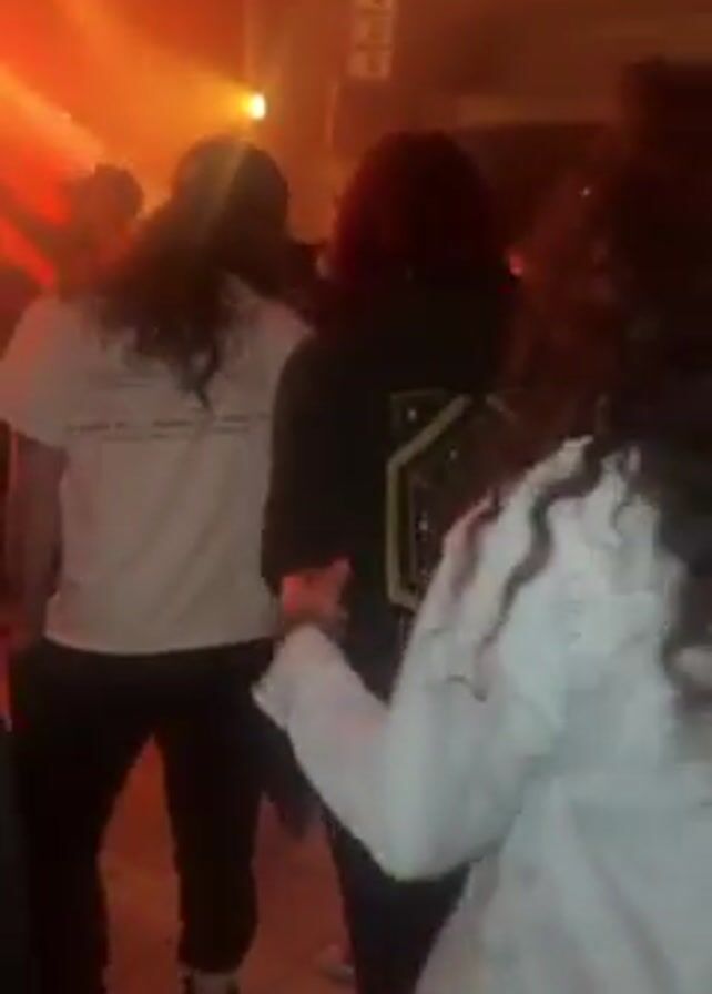 crowd of people at an indoor event, possibly a concert or a rave. The lighting is primarily orange and red, and there is some smoke in the air, creating a hazy atmosphere. People are dressed in casual attire, with some wearing band shirts or jackets with logos on the back. Most of the crowd is facing away from the camera, making it difficult to discern individual faces. There are speakers on the wall. The camera moves slightly.