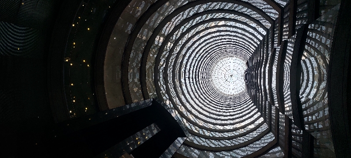 An upward view of a cylindrical building's atrium reveals a repeating pattern of concentric rings, likely balconies or floors