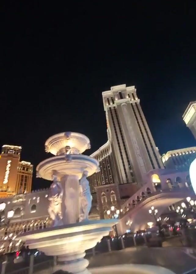 The video is shot outdoors at night, showcasing a grand view of The Venetian hotel and casino complex in Las Vegas