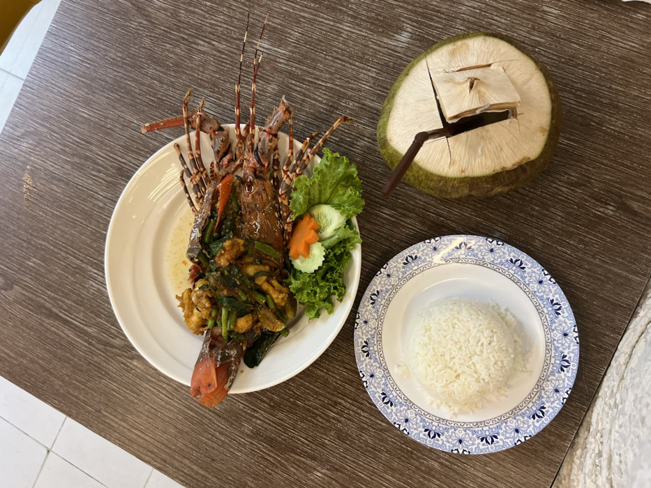 A prepared meal is displayed on a dark brown wooden table. The precise location within Patong, Thailand, cannot be determined from the image. The primary subject is a large, cooked spiny lobster presented on a white oval plate. The lobster is covered with a green herb-based sauce and contains additional protein pieces. The plate includes a garnish of green lettuce, two cucumber slices, and one carved orange carrot. To the lower left, a white bowl containing plain white rice rests on a round plate with a blue and white patterned rim. To the lower right, a whole green coconut, partially opened at the top, contains a brown drinking straw. The table exhibits a visible wood grain. Portions of a light-colored tiled floor are visible in the background on the left side. No individuals, actions, or interactions are present in the scene.