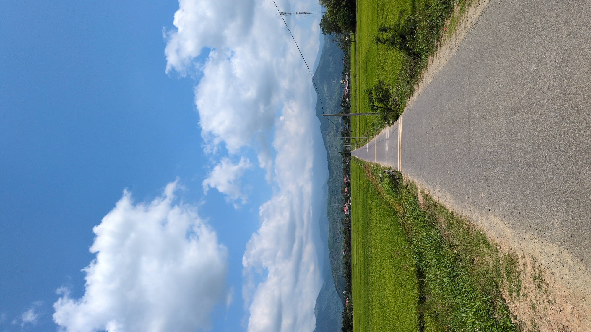 The image displays a straight, narrow asphalt road extending into the distance through an expansive rural landscape in Unknown, Vietnam, under a bright blue sky with scattered white clouds. The road, featuring faint yellow transverse markings in the mid-foreground, is flanked on both sides by vast, vibrant green rice paddies. Beyond the rice fields and in the mid-distance, a small cluster of residential buildings with red-tiled roofs is visible, partially obscured by trees. A line of utility poles with overhead wires runs parallel to the right side of the road. In the far background, a range of large, undulating mountains with varied green foliage stretches across the horizon, partially veiled by atmospheric haze or low clouds. The scene is devoid of people, animals, or vehicles, presenting a static, pastoral view under clear daylight conditions.