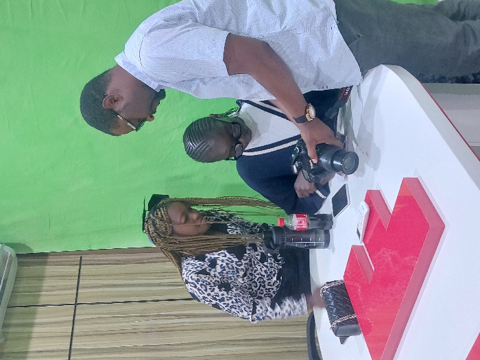 The image depicts three individuals engaged in an instructional or collaborative moment within an indoor studio or office environment in Jos, Nigeria. A female with light brown braids and a leopard print blouse stands to the left, observing the activity on the white curved table. Seated at the center of the table is another female, wearing glasses, a white high-neck top, and a dark blue cardigan with white stripes, actively holding a black DSLR camera. To her right, a male with a beard and glasses, dressed in a light-colored patterned short-sleeved shirt, stands and leans over, his hand near the camera as if providing instruction or assistance. The table displays several items: a prominent, large red three-dimensional letter "F," a black water bottle, a Coca-Cola bottle, a black smartphone, a small white remote control, and a black quilted handbag. The background features a bright green wall, suggesting a chroma key setup, and a wooden panel wall with an air conditioning unit visible in the upper left.