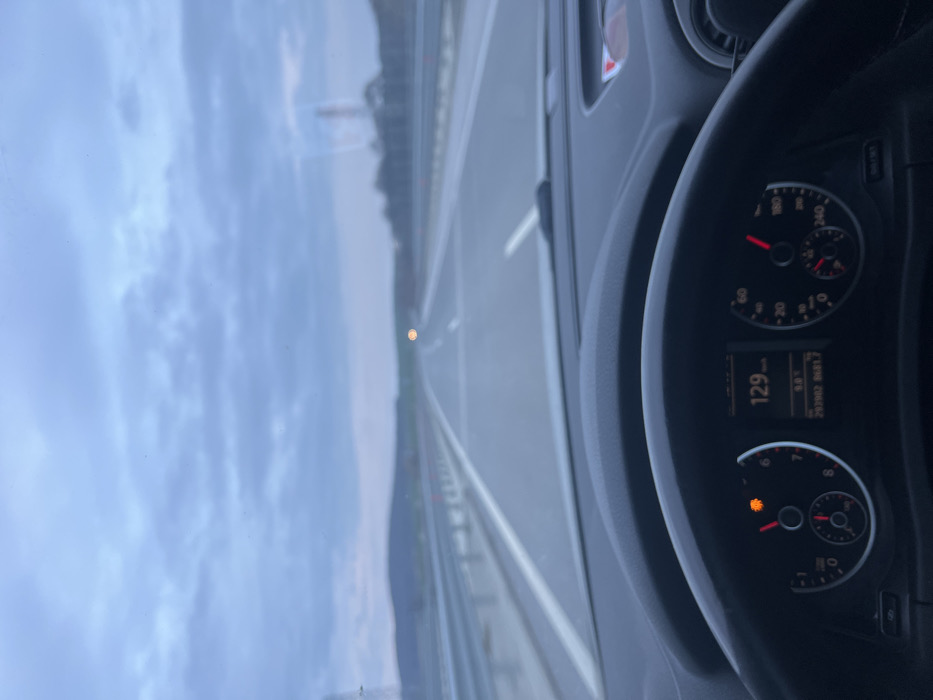 The image depicts a forensic view from the driver's perspective inside a vehicle traveling on a highway in Yazdach, Bulgaria. The dashboard and steering wheel are visible in the foreground. The instrument cluster displays the vehicle's speed at 129 km/h. An orange warning light, consistent with a tire pressure indicator, is illuminated on the left side of the cluster. The outside temperature is 9.0°C, and the odometer reads 292962 total kilometers with a trip meter at 8681.7 kilometers. The multi-lane asphalt highway extends into the distance, marked by white lane dividers. Metal guardrails are visible along the left side of the road. The sky is overcast with scattered clouds, indicating either dusk or dawn. In the distance, low hills are visible on the left horizon, while a tall, red-and-white striped industrial chimney structure stands on the right horizon. A single, distinct, yellow-orange light, likely from another vehicle's headlight, is visible far down the highway in the center of the frame. No individuals are visible in the scene.