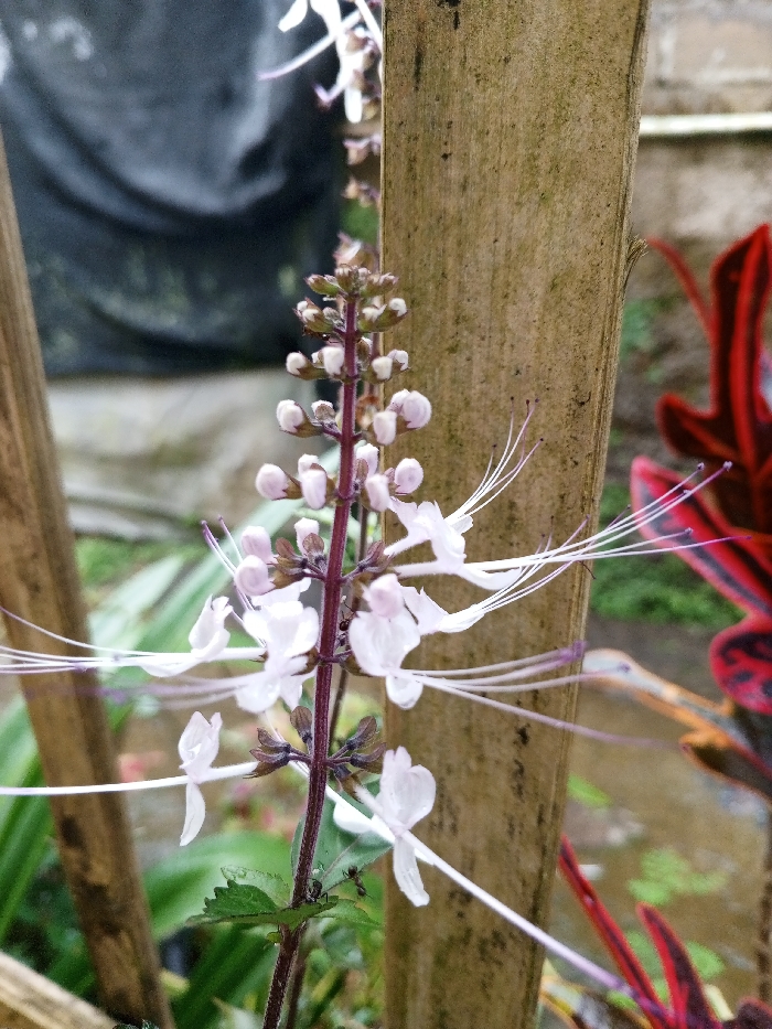 A stalk of cat's whiskers plant ascends, featuring pale purple buds and white flowers with elongated stamens. Small ants are visible on the stem. The plant is positioned near a rough, wooden post, which is part of a structure. Behind it, red-leaved plants add a splash of color. Green foliage is also seen in the background, suggesting an outdoor setting.