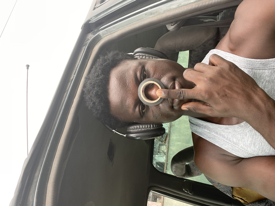 An adult male with dark skin and short, dark curly hair is depicted seated inside a vehicle in Ado, Nigeria. He is wearing a light grey tank top and black over-ear headphones. His right index finger is extended, holding a roll of black electrical tape with a brown core against the bridge of his nose, directly below his eyes. He looks forward towards the camera with a neutral expression. The vehicle's interior shows a dark headliner and window frame. Through the open window, a light green-painted building is visible in the background under an overcast sky, with a vehicle antenna protruding upwards in the upper right.