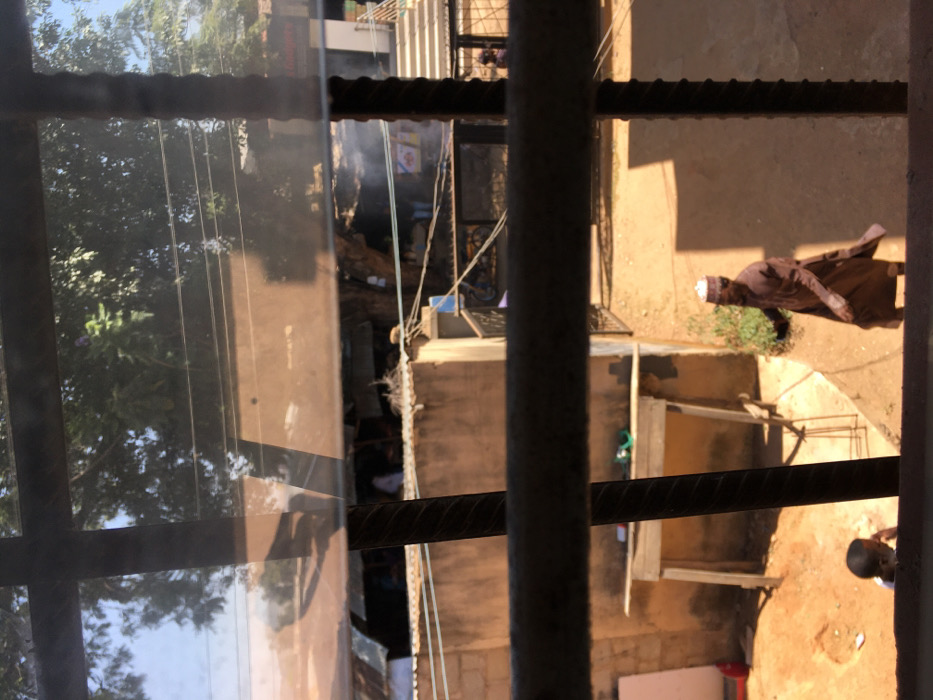 The image displays an outdoor scene in Jos, Nigeria, viewed through a window secured by dark, ribbed metal bars. A discernible reflection on the window glass partially obscures the upper section of the view. Under strong daylight, the immediate foreground on the left features the back of a young child in a light-colored top, situated on dusty, uneven ground. A man, wearing a long brown garment and a light cap, walks rightwards across a dirt path. To the left, a basic wooden table with two-by-four supports holds a few small, indistinct items, with a metal stool visible beneath it. The midground is dominated by a weathered, light brown wall. Beyond this wall, structures topped with corrugated metal roofs are visible, partially framed by a large, leafy tree. Several utility lines traverse horizontally across the mid-distance. The background reveals additional buildings, indistinct human figures, and a plume of smoke rising. On the far right, concrete steps with a metal railing ascend. The sky is clear.