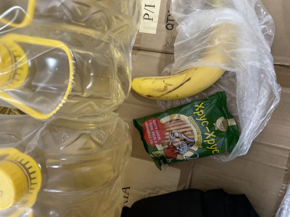 The scene is an overhead view of various foodstuffs and packaging materials resting on brown cardboard boxes, located in Unknown, Unknown. The upper portion of the frame features two large, transparent plastic bottles containing a pale yellow liquid, consistent with cooking oil. Each bottle has a yellow ribbed screw cap and a yellow plastic handle, and both are encased in clear plastic wrapping. Below these bottles, a green foil-like snack package, labeled "ХРУС-ХРУС" in yellow Cyrillic and featuring a cartoon mouse holding a breadstick, is visible. The package is partially open, revealing numerous slender, brown stick-shaped snacks. Adjacent to the snack package, a single ripe yellow banana, marked with minor brown blemishes, is partially contained within a small, clear plastic bag. A dark, indistinct object, likely fabric, is visible along the far left edge of the frame. The immediate background consists of brown cardboard boxes, one of which displays partial black text reading "P/L" and "QTY". No individuals are present, and no specific actions or interactions are depicted beyond the static arrangement of these items.