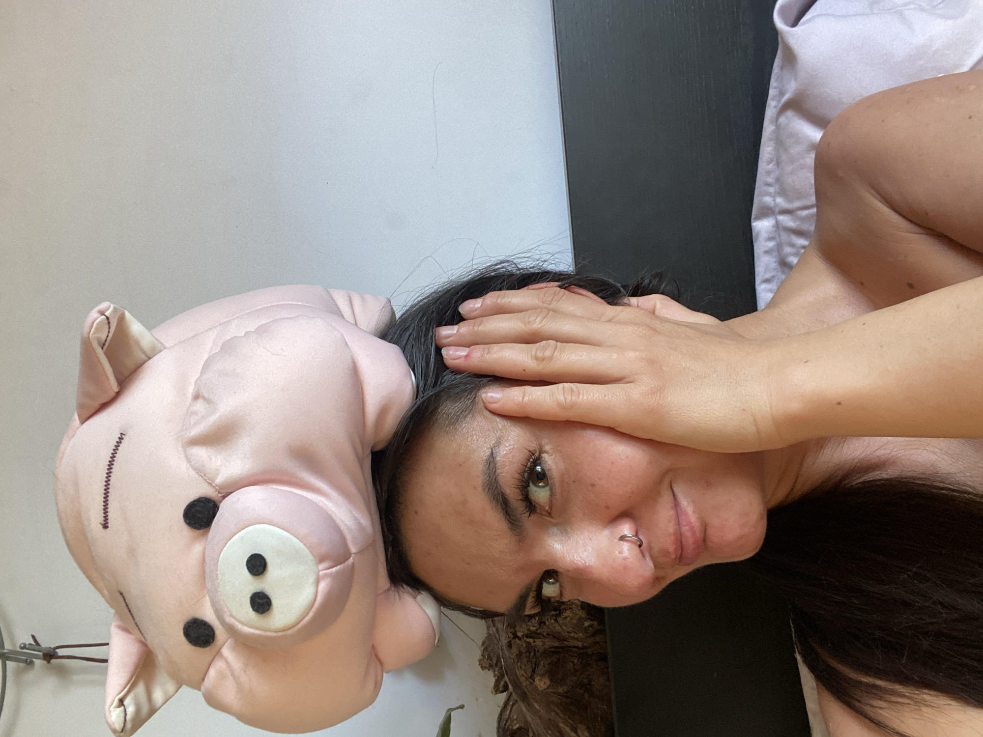 - "A woman is lying on her side with a pink stuffed pig toy on her head" by FM-jFREF2, licensed under CC BY 4.0