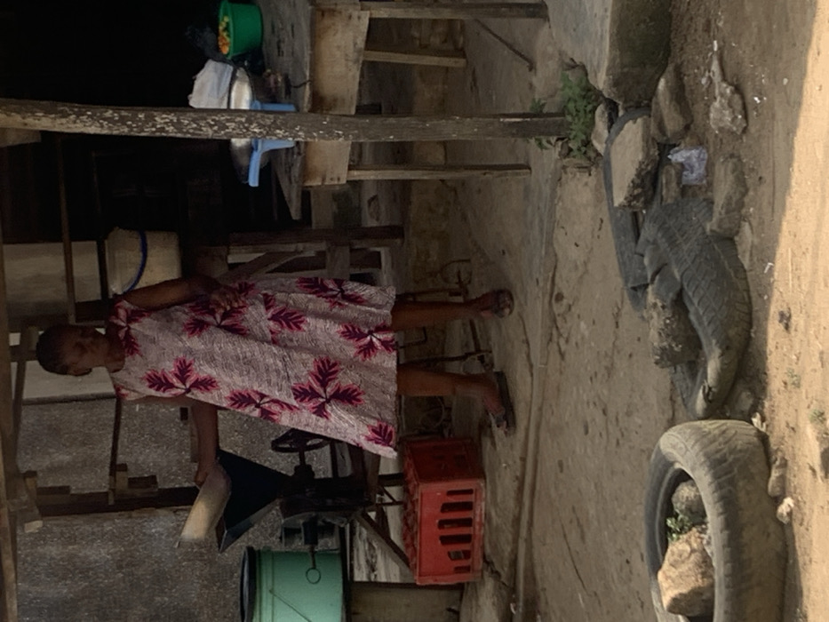 A woman is depicted standing within an open-sided structure, likely a food processing or market stall, in Ijegun, Nigeria