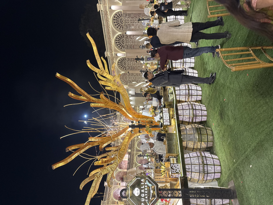 A night scene captures an outdoor event with a golden tree-like structure dominating the foreground. Tables, adorned with white decorations, are surrounded by people, some dressed in chef attire. Patrons stand nearby, casually dressed. A sign reading "Pugalia Caterer" is prominent. The backdrop features an ornately designed building, and a bright moon adds to the nighttime ambiance. The ground is covered in green turf.